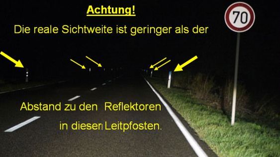 Am Beispiel der abgebildeten Landstraße wird deutlich, wie sich das Sichtfeld vom Tag zur Nacht verändert: