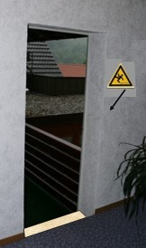 Sehr leicht kann die Stufe (gelb gepunktet umrandet) auf den Außenflur bei diesem Hotel übersehen werden. Der Bodenbelag hat bei der Stufe den gleichen Bodenbelag wie der Flur. Die Stahltüre hat über der Klinke ein Schild mit dem Hinweis "Vorsicht Stufe", doch die Türe steht auf und das Schild ist dadurch nicht unmittelbar sichtbar - Es wird schnell übersehen.